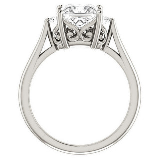 This beautiful engagement ring features a cathedral design with a princess cut colorless lab grown diamond center stone and two smaller round cut colorless lab grown diamond side stones (0.10 - 0.30ct). Available in your choice of 14k gold, 18k gold or platinum.