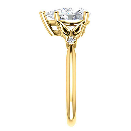 This beautiful engagement ring features a cathedral setting with a floral design, a pear cut colorless lab grown diamond center stone and VS, E/F quality diamond side stones, set in your choice of 14k gold, 18k gold or platinum. The band measures approximately 1.8mm in width.
