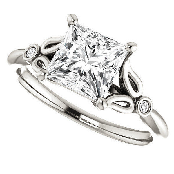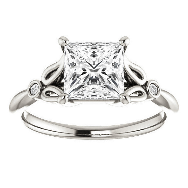 This beautiful engagement ring features a cathedral setting with a floral design, a princess cut colorless lab grown diamond center stone and VS, E/F quality diamond side stones, set in your choice of 14k gold, 18k gold or platinum. The band measures approximately 1.8mm in width.