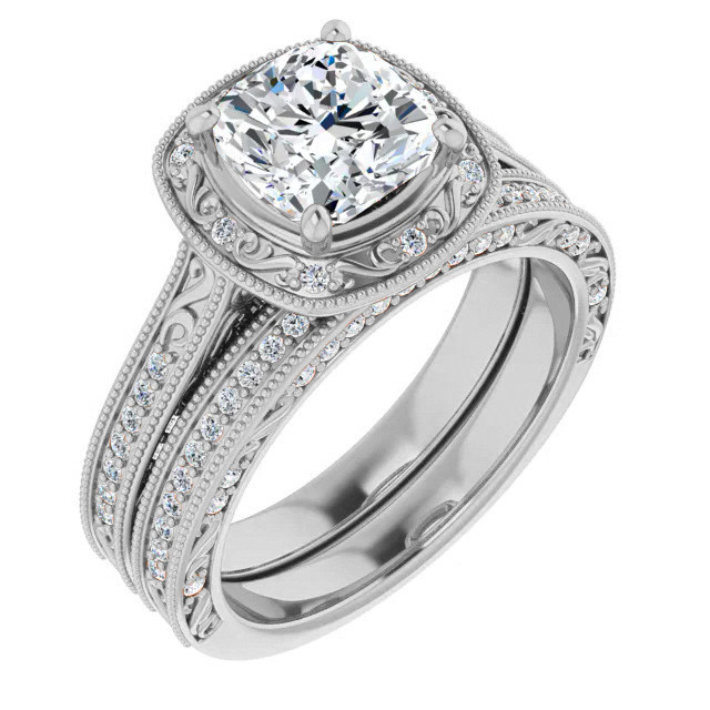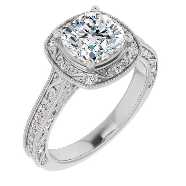 This beautiful engagement ring features a halo design with scroll and milgain accents, a cushion cut colorless lab grown diamond center stone, and 0.20ct - 0.22ct of diamond side stones, set in your choice of 14k gold, 18k gold or platinum. Add the optional matching band to make this a complete wedding set.