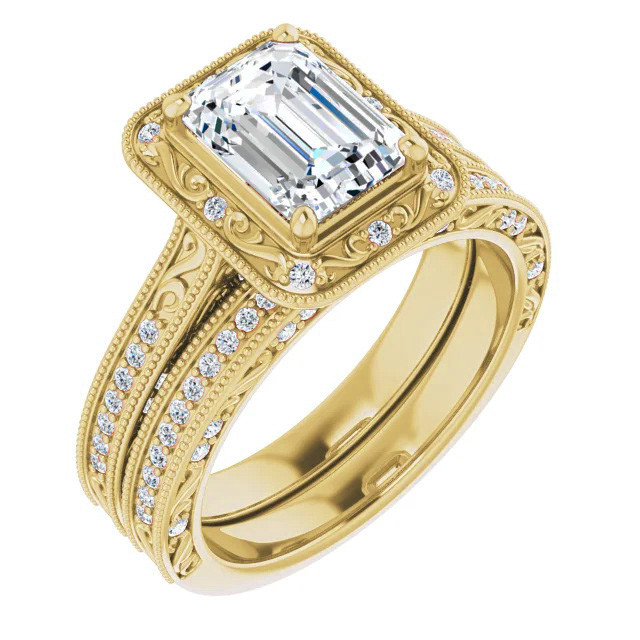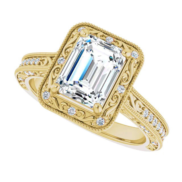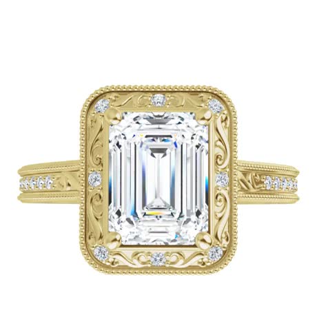 This beautiful engagement ring features a halo design with scroll and milgain accents, your choice of an emerald or radiant cut colorless lab grown diamond center stone, and 0.19ct - 0.23ct of diamond side stones, set in your choice of 14k gold, 18k gold or platinum. Add an optional matching band to make it a wedding set.