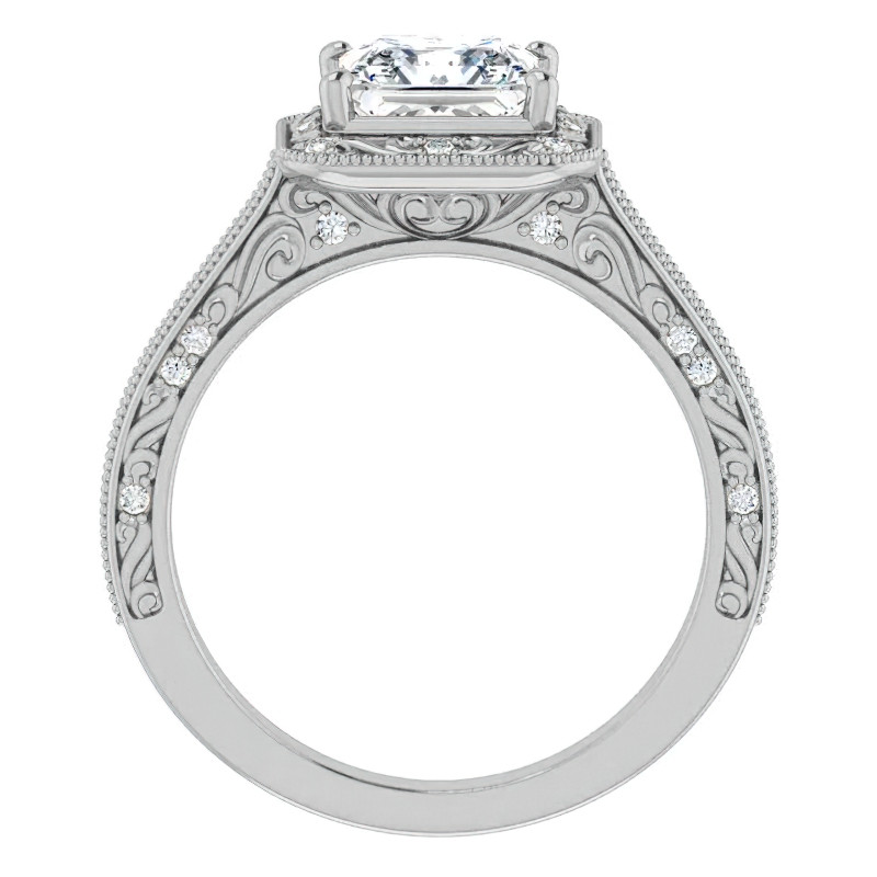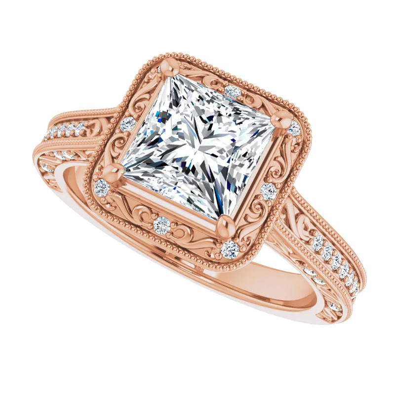 This beautiful engagement ring features a halo design with scroll and milgain accents, a princess cut colorless lab grown diamond center stone, and 0.17 - 0.23cts of diamond side stones, set in your choice of 14k gold, 18k gold or platinum. Add the optional matching band to make it a complete set.