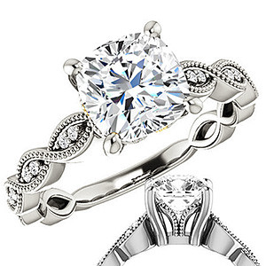 This beautiful engagement ring features an infinity styled design with milgrain accents, a cushion cut lab grown diamond center stone, 0.10cts of diamond side stones, and is set in your choice of 14k gold, 18k gold or platinum. Add the optional matching band to make it a complete set.