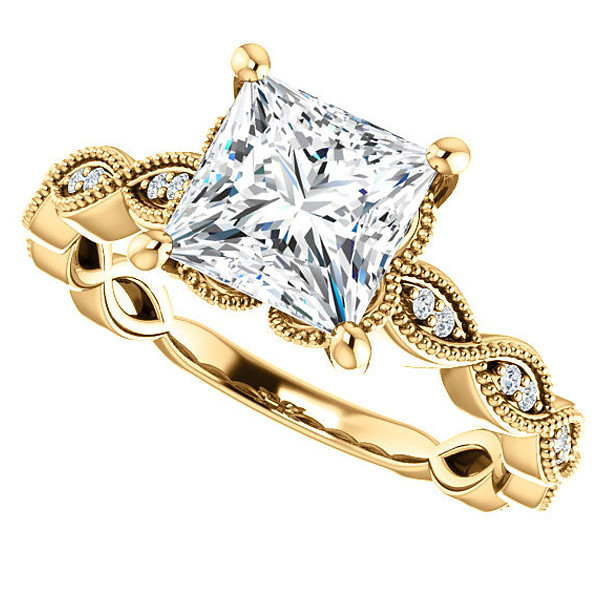 This beautiful engagement ring features an infinity styled design with milgrain accents, a princess cut colorless lab grown diamond center stone, 0.10cts of diamond side stones, and is set in your choice of 14k gold, 18k gold or platinum. Add the optional matching band to make it a complete set.