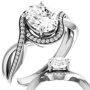 This beautiful engagement ring features a twisted infinity halo design with split shanks, an oval cut colorless lab grown diamond center stone, and 0.14ct - 0.17ct of diamond side stones, set in your choice of 14k gold, 18k gold or platinum.