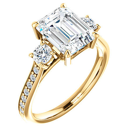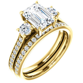This beautiful three-stone engagement ring features a cathedral design, your choice of an emerald or radiant cut colorless lab grown diamond center stone with two smaller round brilliant cut lab grown diamond side stones, and 0.16ct of colorless lab grown diamond side stones in 14k gold, 18k gold or platinum. Add the optional matching band to complete this wedding set.