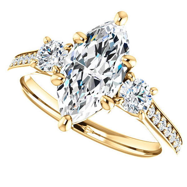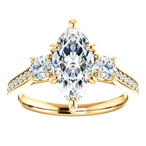 This beautiful three-stone engagement ring features a cathedral design, a marquise cut lab grown diamond center stone with two smaller round brilliant cut colorless lab grown diamond side stones, and 0.16ct of lab grown diamond side stones in 14k gold, 18k gold or platinum.