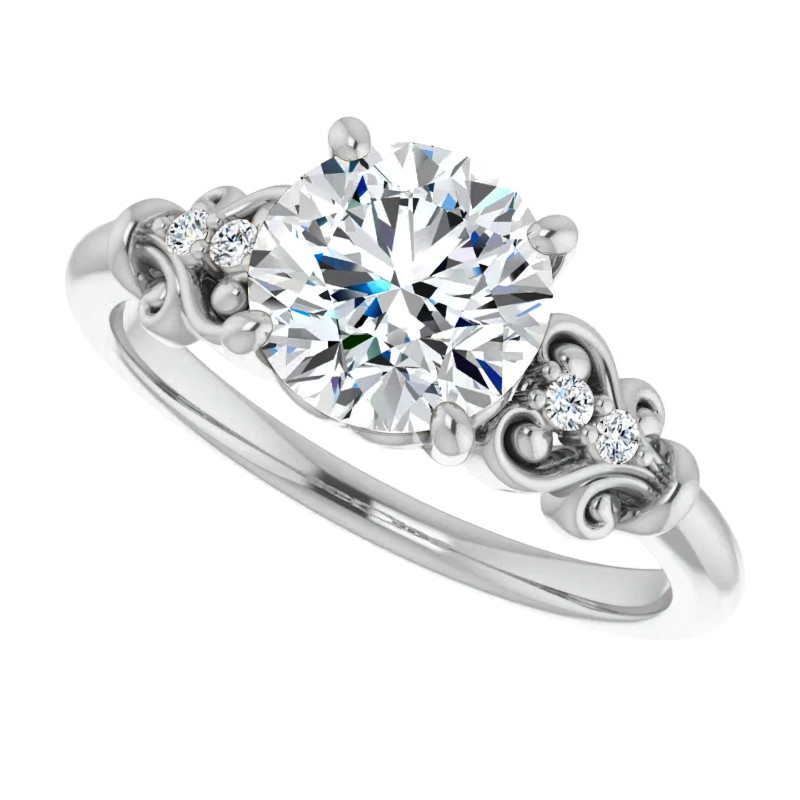 This beautiful engagement ring features a delicate scroll design, set with a round brilliant cut colorless lab grown diamond center stone, 0.05ct of diamond side stones, and is available in your choice of 14k gold, 18k gold or platinum.