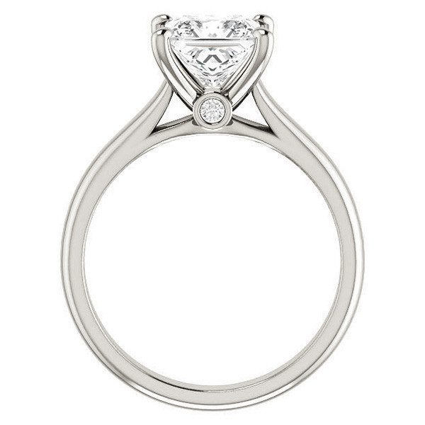This beautiful engagement ring features a classic cathedral design, a princess cut colorless lab grown diamond center stone, two bezel set "surprise" diamonds (VS, E/F quality, 0.04tcw), and is set in your choice of 14k gold, 18k gold or platinum.