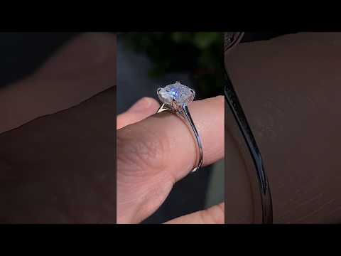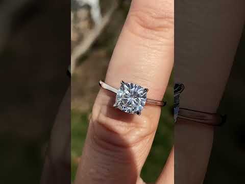 Introducing an exquisite solitaire engagement ring that exudes grace and sophistication. The petite cathedral design with claw shaped prongs is designed to highlight the center stone, which is a stunning cushion cut lab grown diamond.