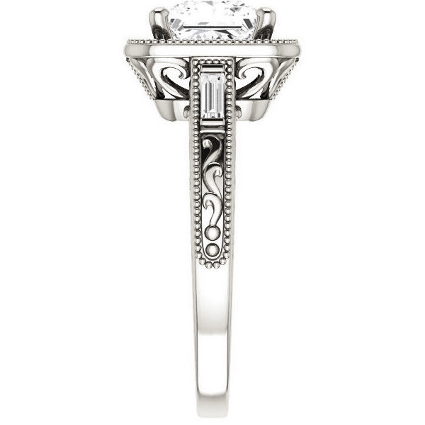This beautiful lab grown diamond engagement ring features a halo design with milgrain accents, a princess cut colorless lab grown diamond side stone, two straight baguette accent stones, and 0.14 - 0.21ct of VS, E/F quality round brilliant diamond side stones, set in your choice of 14k gold, 18k gold or platinum. Add the optional matching band to make it a complete set.