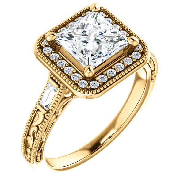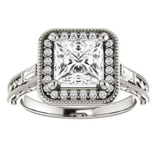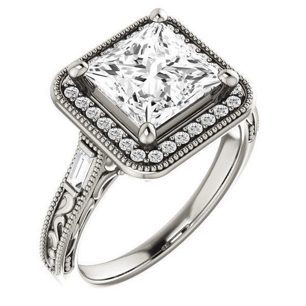 #enr185-pr Princess Lab Grown Diamond & Baguette Halo Engagement with Milgrain
