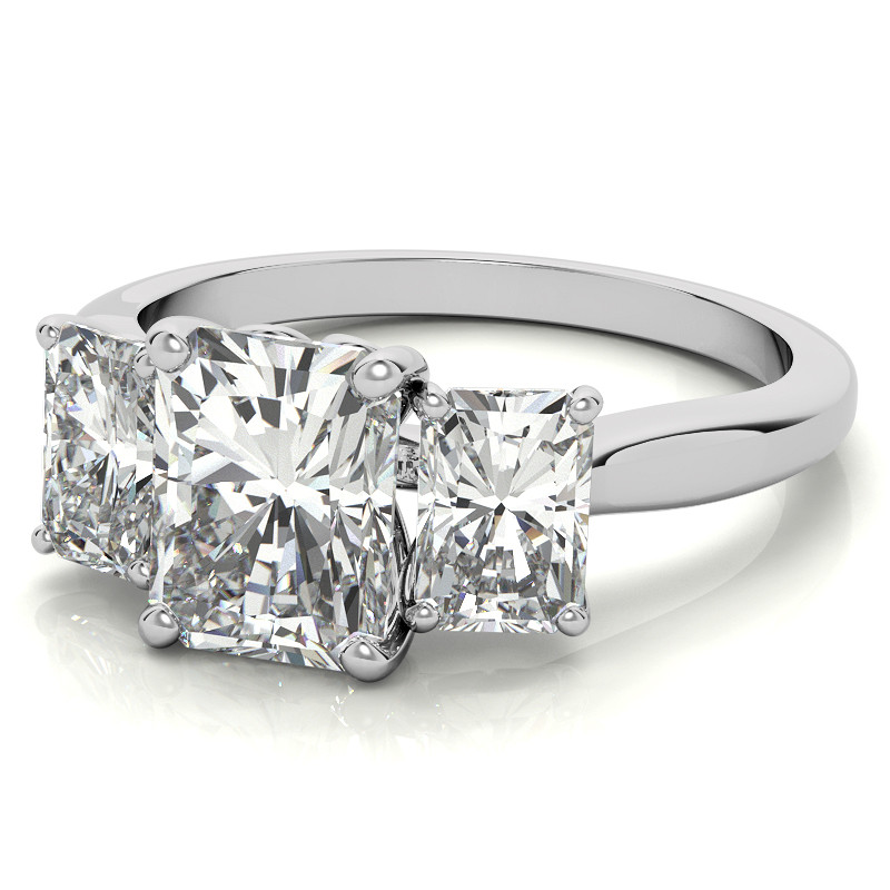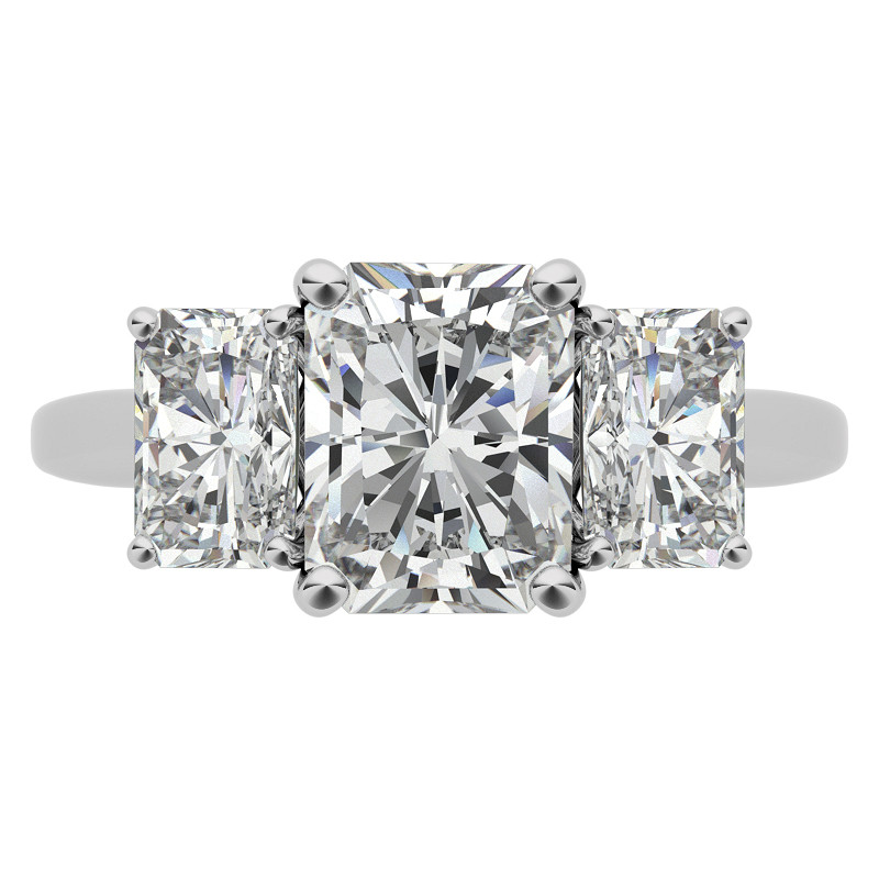 This beautiful engagement features a unique prong design with your choice of an emerald or radiant cut colorless lab grown diamond center stone, two emerald or radiant cut side stones (0.65ct each), and is set in your choice of 14k gold, 18k gold or platinum.