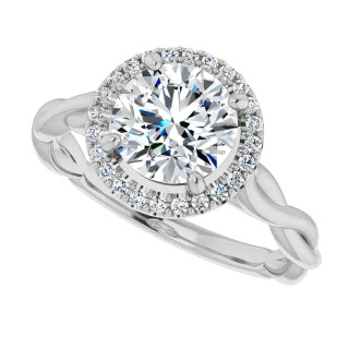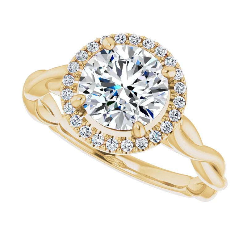This beautiful lab grown diamond engagement ring features a twisted band design in a cathedral halo setting, a round brilliant lab grown diamond center stone, 0.09 - 0.16ct of diamond side stones, and is set in your choice of 14k gold, 18k gold or platinum. Add the optional matching band to make it a complete bridal set.