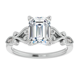This unique antique scroll designed engagement ring has a split-shank milgrain design, your choice of an emerald or radiant cut colorless lab grown diamond center stone, 0.02ct of VS, colorless diamond side stones, and is cast in your choice of 14k gold, 18k gold or platinum.