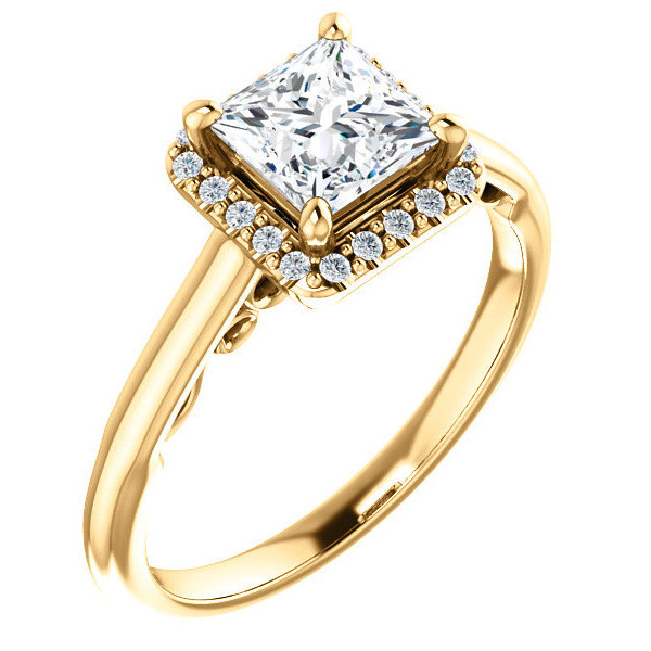 This beautiful lab grown diamond engagement ring features a halo design with scroll accents, a Princess cut colorless lab grown diamond center stone, 0.09 - 0.13ct of diamond side stones, set in your choice of 14k gold, 18k gold or platinum. Add the optional matching band to make it a complete bridal set.