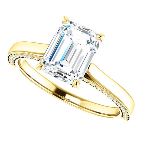 This beautiful lab grown diamond engagement ring features a cathedral design, your choice of an emerald or radiant cut colorless lab grown diamond center stone, 0.28ct of diamond side stones, and is set in your choice of 14k/8k gold or platinum.