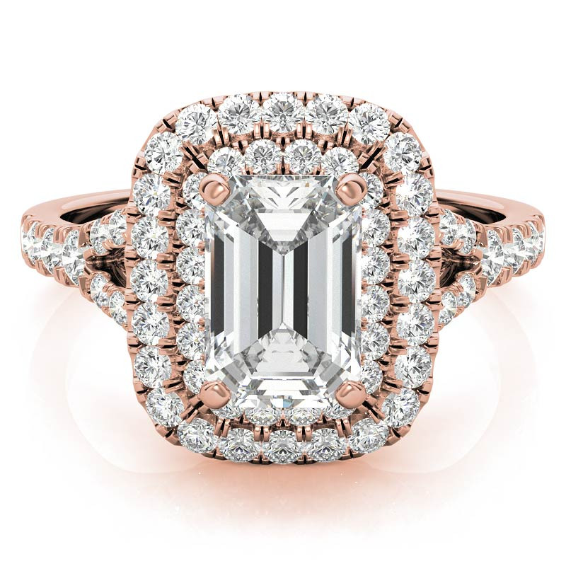 This beautiful lab grown diamond engagement ring features a cathedral design with a double halo, an emerald or radiant cut colorless center stone, and 0.43ct - 0.47ct of lab grown diamond side stones. Available in your choice of 14k, 14k two-toned, or 18k gold.