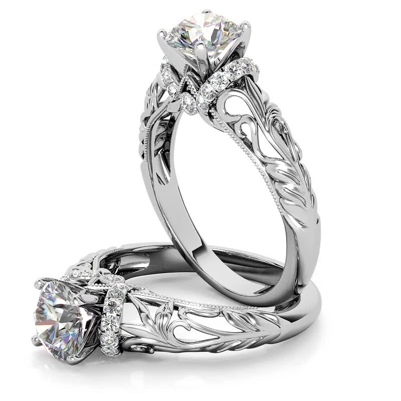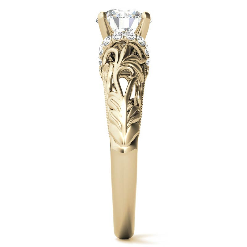 This beautiful lab grown diamond engagement ring features an antique etched design with milgrain accents, your choice of size and shape lab grown diamond center stone, and 0.16ct of lab grown diamond side stones. Available in 14k or 18k gold.