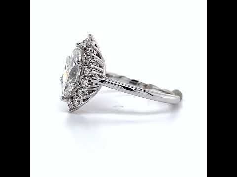 This beautiful lab grown diamond engagement ring features a halo design, set with a marquise cut lab grown diamond center stone with 0.42ct - 0.66ct surrounding round colorless lab grown diamond side stones, set in your choice of 14k gold, 18k gold or platinum.