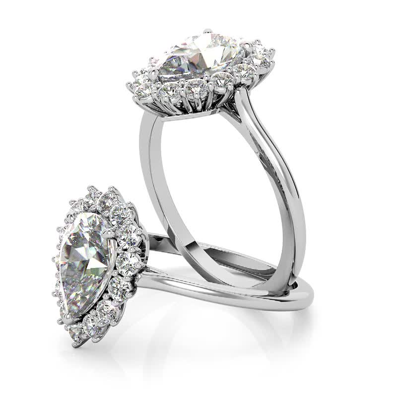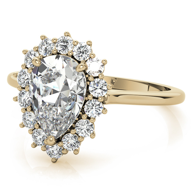 This beautiful lab grown diamond engagement ring features a halo design, set with a pear cut colorless lab grown diamond center stone with 0.42ct - 0.66ct surrounding round colorless lab grown diamond side stones, set in your choice of 14k gold, 18k gold or platinum.