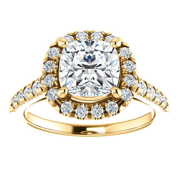 This beautiful engagement ring features a cathedral halo design, a cushion cut lab grown diamond center stone and 0.50ct of round brilliant colorless lab grown diamond side stones, set in your choice of 14k gold, 18k gold or platinum.