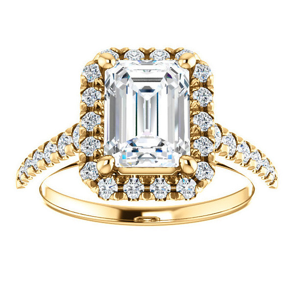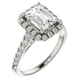 This beautiful engagement ring features a cathedral halo design, an emerald or radiant cut lab grown diamond center stone and 0.50ct of round brilliant colorless lab grown diamond side stones, set in your choice of 14k gold, 18k gold or platinum.