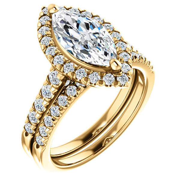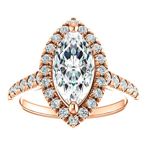 This beautiful engagement ring features a cathedral design with a halo and a marquise cut lab grown diamond center stone and 0.50ct of round brilliant colorless lab grown diamond side stones, set in your choice of 14k gold, 18k gold or platinum.