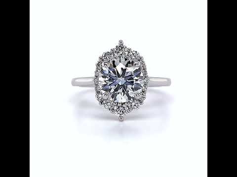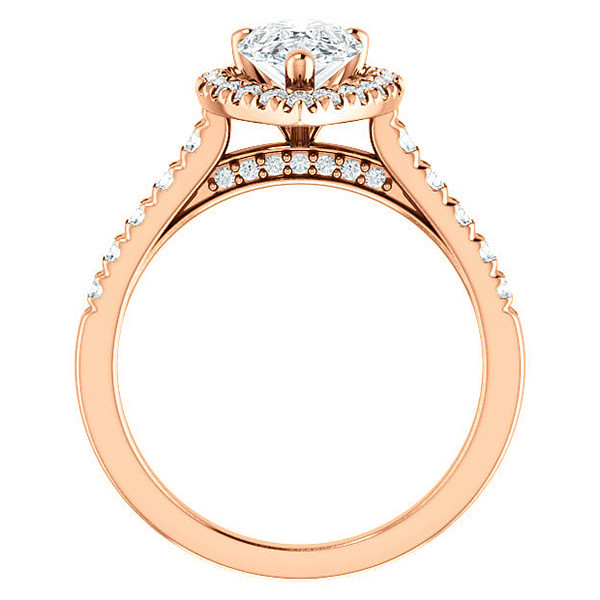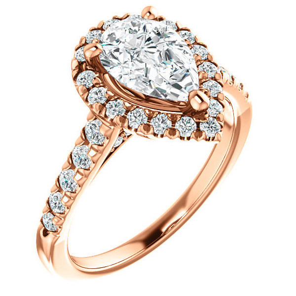 This beautiful engagement ring features a cathedral halo design, a pear cut lab grown diamond center stone and 0.50ct of round brilliant colorless lab grown diamond side stones, set in your choice of 14k gold, 18k gold or platinum.
