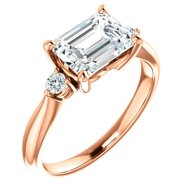 This beautiful engagement ring features a three-stone design with an Emerald or Radiant cut lab grown diamond colorless center stone and two round brilliant lab grown diamond side stones, set in your choice of 14k gold, 18k gold or platinum.