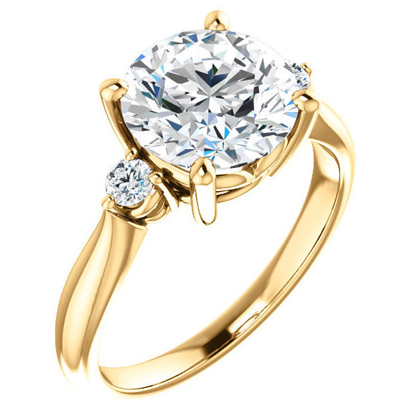 This beautiful engagement ring features a three-stone design with a round brilliant cut lab grown diamond colorless center stone and two lab grown diamond round side stones, set in your choice of 14k gold, 18k gold or platinum.