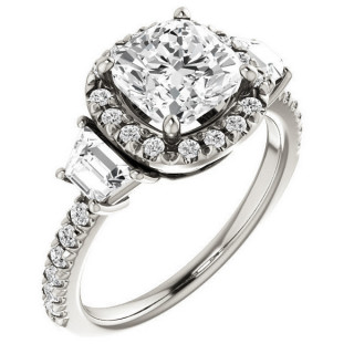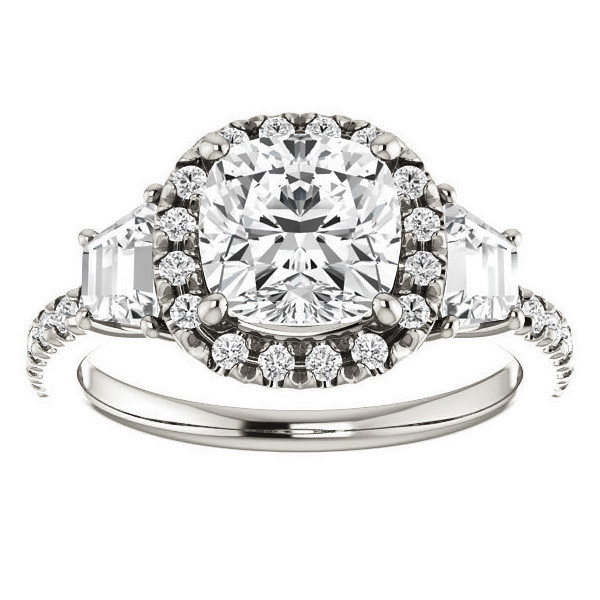This beautiful engagement ring features a halo design with a cushion cut lab grown diamond center stone, two 1/4ct each trapezoid cut lab grown diamond side stones, round brilliant lab grown diamond side stones, and is set in your choice of 14k gold, 18k gold or platinum.