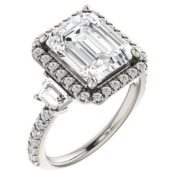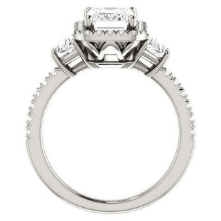 This beautiful engagement ring features a halo design with an emerald or radiant cut lab grown diamond center stone, two 1/4ct each trapezoid cut lab grown diamond side stones, round brilliant lab grown diamond side stones, and is set in your choice of 14k gold, 18k gold or platinum.