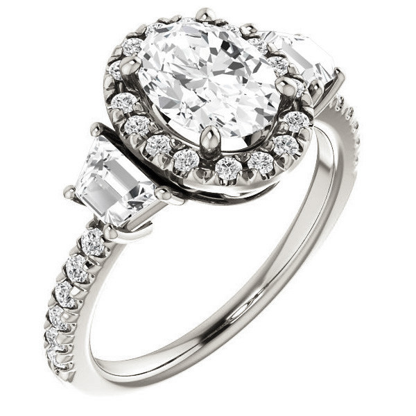 This beautiful engagement ring features a halo design with an oval cut lab grown diamond center stone, two 1/4ct each trapezoid cut lab grown diamond side stones, round brilliant lab grown diamond side stones, and is set in your choice of 14k gold, 18k gold or platinum.