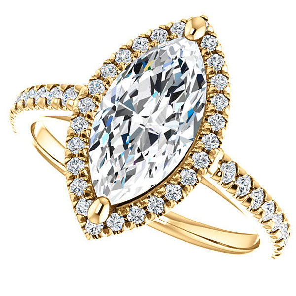 This beautiful engagement ring features a cathedral halo design with a marquise cut lab grown diamond center stone and 0.37ct of diamond side stones, set in your choice of 14k gold, 18k gold or platinum. Add the optional band to make it a complete wedding set.