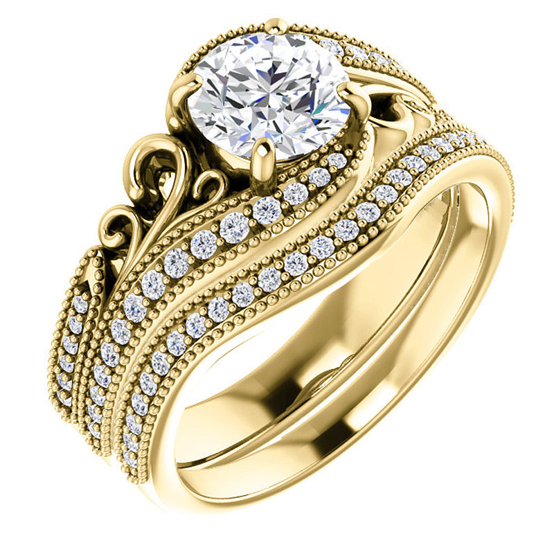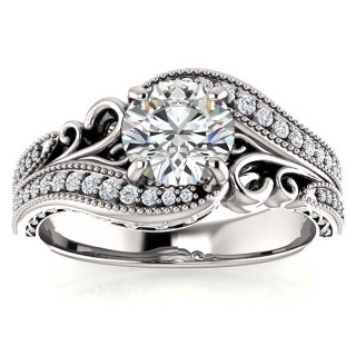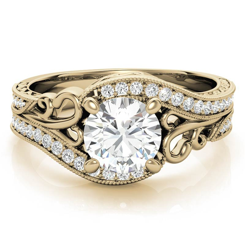 This beautiful engagement ring features an antique inspired bypass design with scroll and milgrain accents, a round brilliant cut lab grown diamond center stone and 0.25ct of lab grown diamond side stones, set in your choice of 14k gold, 18k gold or platinum. Add the optional band to make it a complete wedding set.