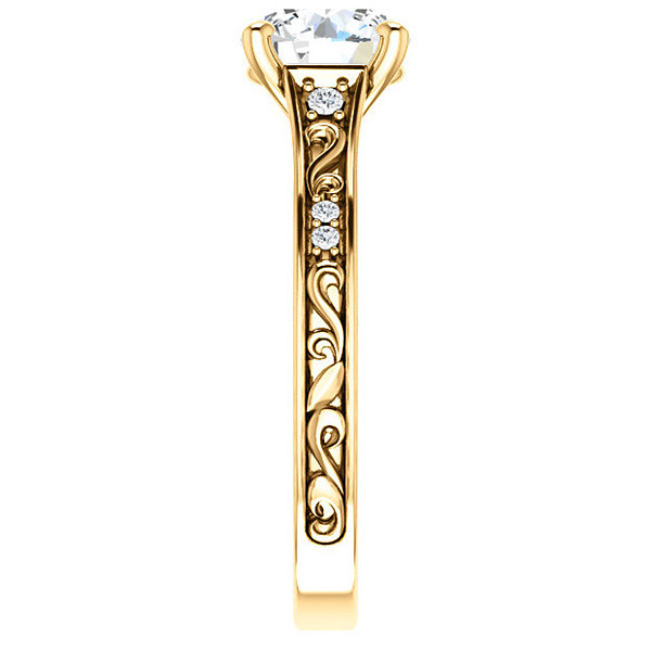 This beautiful engagement ring features a unique design with a Round cut lab grown diamond center stone and 0.06ct of lab grown diamond side stones, set in your choice of 14k gold, 18k gold or platinum. Add the optional band to make it a complete wedding set.