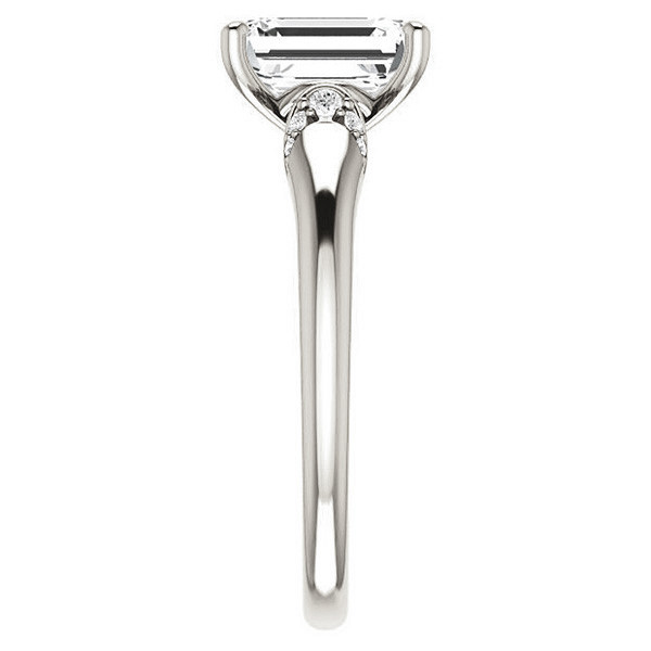 This beautiful engagement ring features a Three-Stone design with an Emerald or Radiant cut lab grown diamond center stone and 0.10ct of round brilliant colorless lab grown diamond side stones, set in your choice of 14k gold, 18k gold or platinum. Add the optional band to make it a complete wedding set.