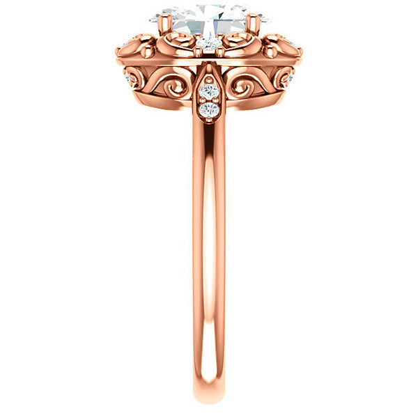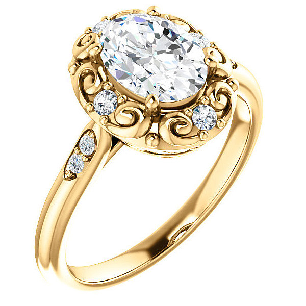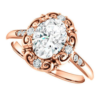 This unique engagement ring features an antique inspired scroll halo, an oval cut colorless center stone, with round brilliant lab grown diamond accent stones. It is available in 14k gold, 18k gold or platinum.