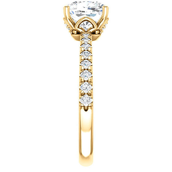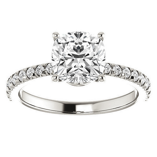 This beautiful engagement ring features a Cushion cut colorless lab grown diamond center stone, and is set in 14k gold, 18k gold or platinum. The combined carat weight of the round lab grown diamond side stones is 0.31ct.