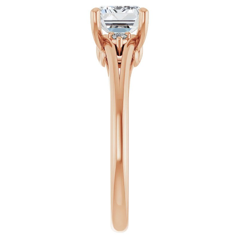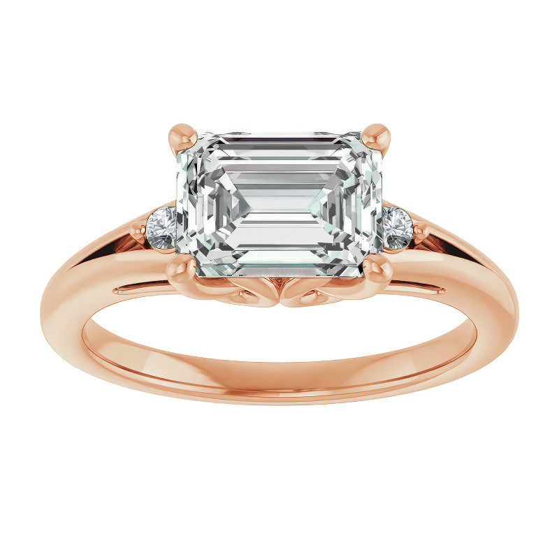 This beautiful engagement ring features a unique East-West design, an Emerald or Radiant cut colorless lab grown diamond center stone, and is set in 14k gold, 18k gold or platinum. The side stone carat weight is 0.06cts and is available in round brilliant colorless lab grown diamond side stones.