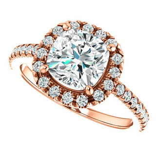 This beautiful engagement ring features a lovely halo design, a Cushion cut colorless lab grown diamond center stone, and is set in 14k gold, 18k gold or platinum. The combined carat weight of the round lab grown diamond side stones is 0.60ct.