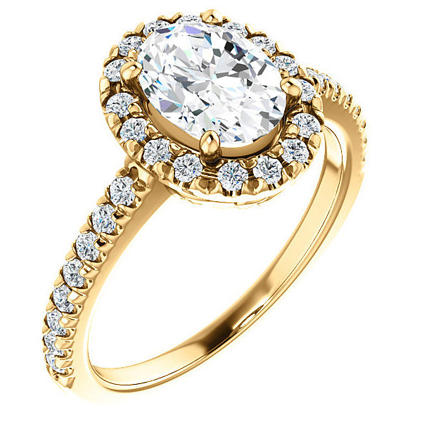 This beautiful engagement ring features a lovely halo design, an Oval cut colorless lab grown diamond center stone, and is set in 14k gold, 18k gold or platinum. The combined carat weight of the round lab grown diamond side stones is 0.60ct.