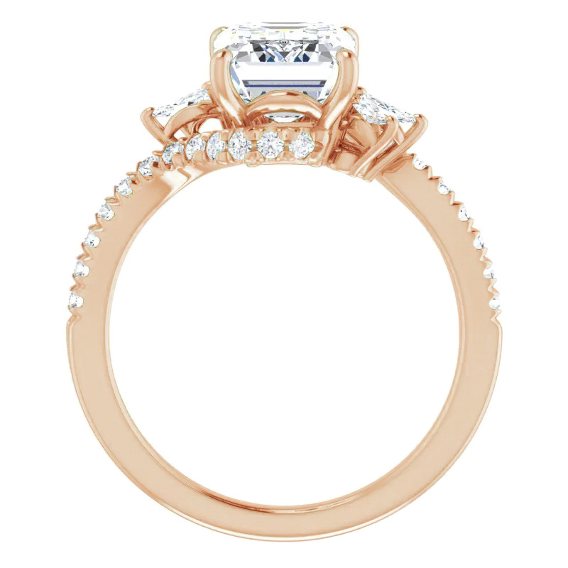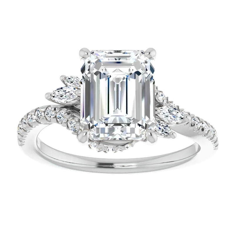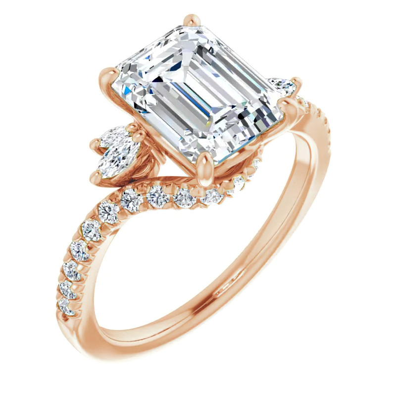 This beautiful engagement ring features a unique design, with a colorless emerald or radiant cut lab grown diamond center stone, and is set in 14k gold, 18k gold or platinum. The combined carat weight of the marquise and round lab grown diamond side stones is 0.50ct. Add the optional matching band to complete this wedding set.