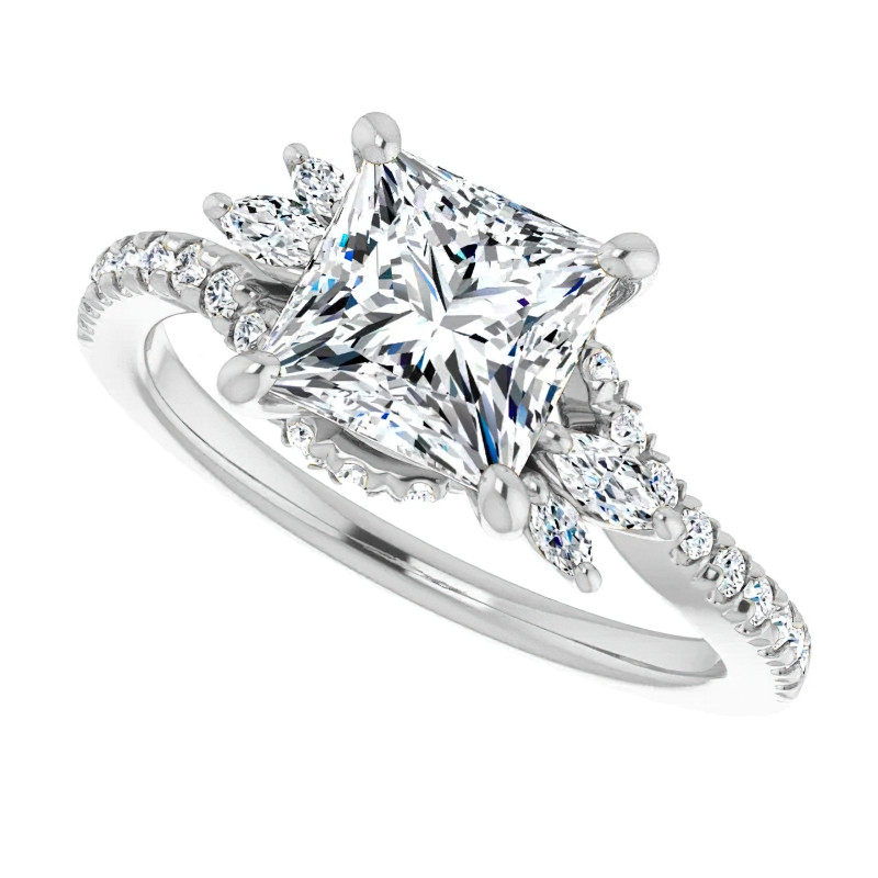 This beautiful engagement ring features a lovely design, a princess cut colorless lab grown diamond center stone, and is set in 14k gold, 18k gold or platinum. The combined carat weight of the marquise and round lab grown diamond side stones is 0.50ct. Add the optional matching band to complete this wedding set.