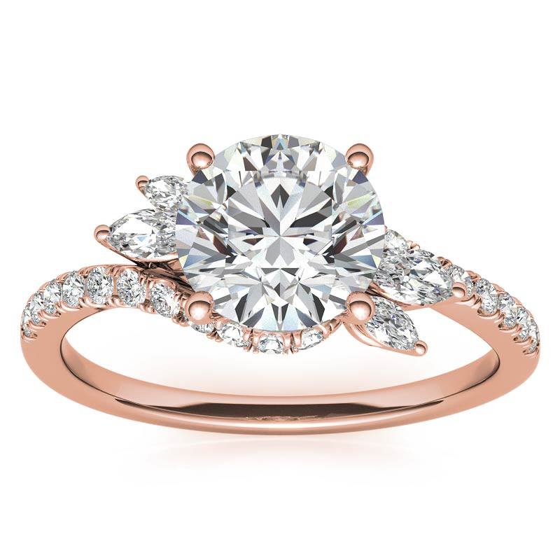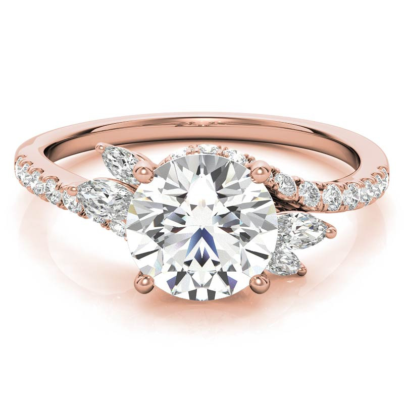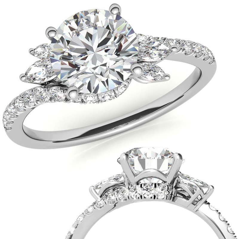 This beautiful engagement ring features a lovely design, a round brilliant colorless lab grown diamond center stone, marquise cut lab grown diamond side stones and is set in 14k gold, 18k gold or platinum. The combined carat weight of the marquise and round lab grown diamond side stones is 0.50ct. Add the optional matching band to complete this wedding set.