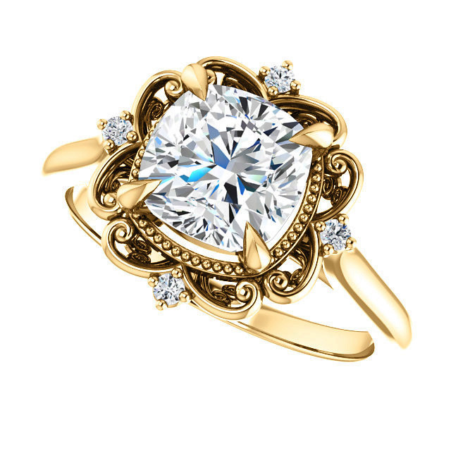 This beautiful engagement ring features a lovely halo design, a cushion colorless lab grown diamond center stone, and is set in 14k gold, 18k gold or platinum. The combined carat weight of the round lab grown diamond side stones is 0.45ct.