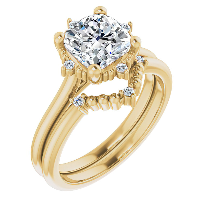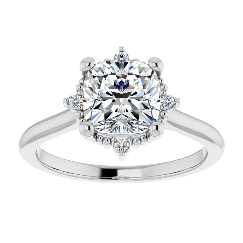 This stunning engagement ring boasts an elegant cathedral design, featuring a cushion cut lab grown diamond center stone in a size of your choosing. The center stone is beautifully accented by a delicate halo of hand-placed milgrain detailing and four round lab grown diamond accent stones (0.03ct - 0.12ct), which give the ring a subtle star-like appearance.