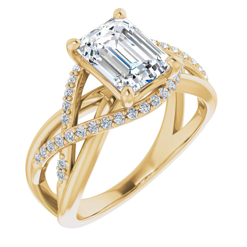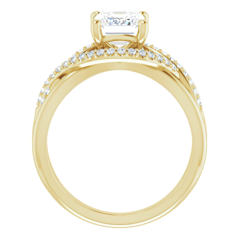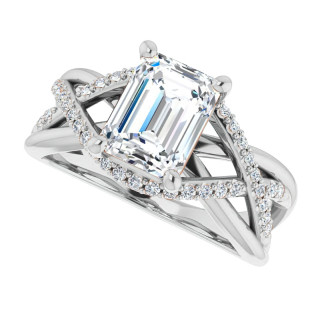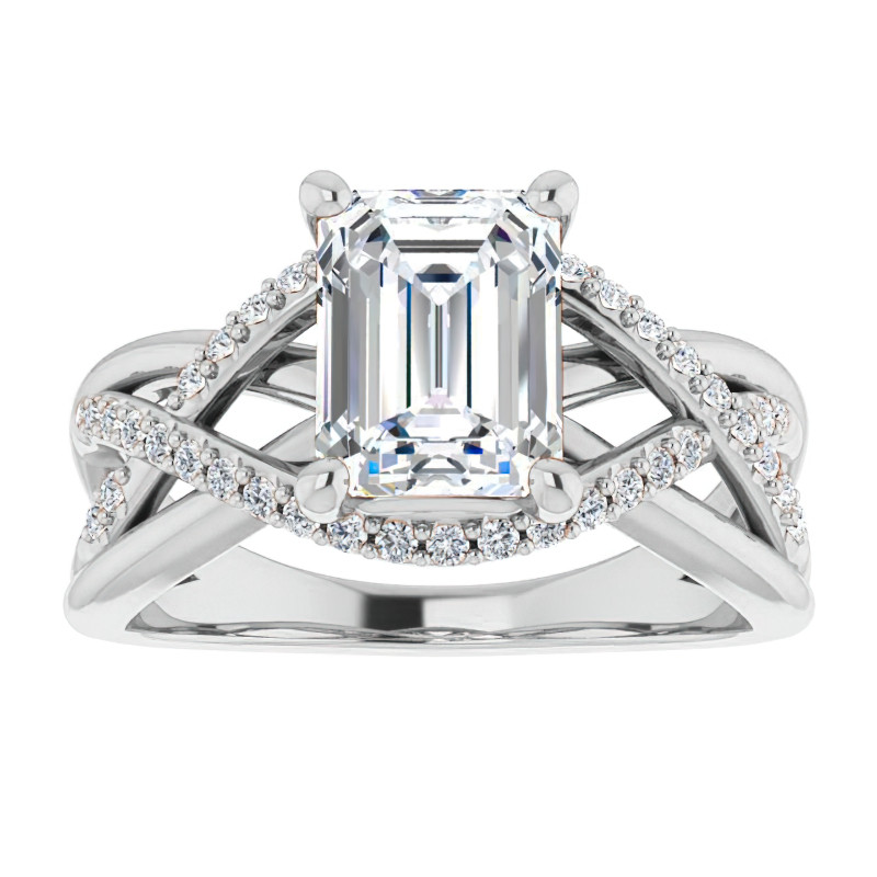 This engagement ring is a true masterpiece of design, with its multi-band style composed of four splits in the shank. The two plain splits elegantly weave together towards the center stone, while the other two feature a stunning infinity design, adorned with round brilliant cut lab grown diamond accent stones (0.19ct - 0.29ct) that gracefully encircle the emerald or radiant cut lab grown diamond center stone.