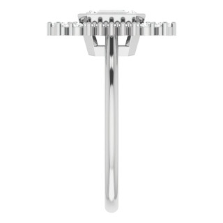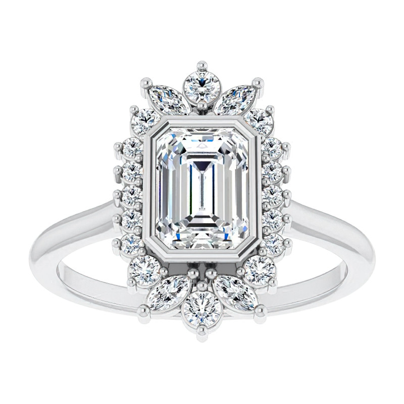 This captivating cathedral engagement ring showcases a stunning halo design, featuring a combination of round brilliant and marquise cut accent stones beautifully encircling a bezel set center stone. You have the option to select from an emerald or radiant cut lab grown diamond, available in the size and quality of your choice.